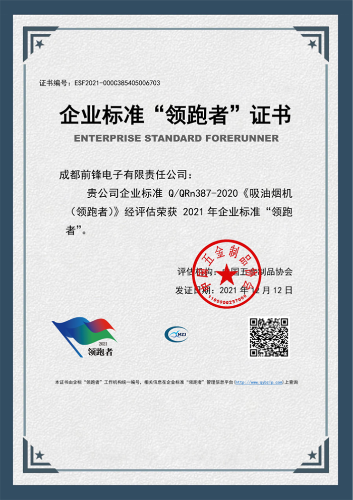 前鋒2021企業(yè)標(biāo)準(zhǔn)“領(lǐng)跑者”證書(shū)